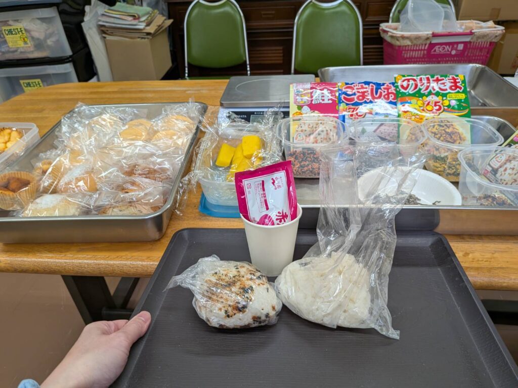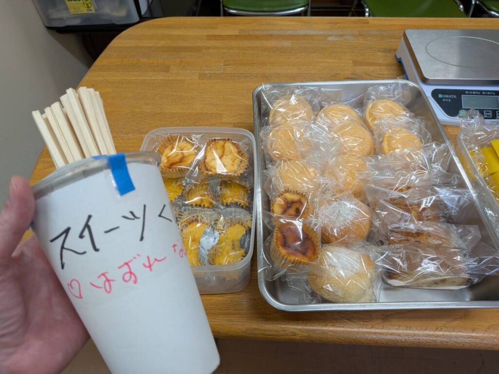 赤だしのお味噌汁と、スイーツ作りが得意な職員が腕を振るったスイーツもあり、クジで何のスイーツが当たるかはお楽しみです。