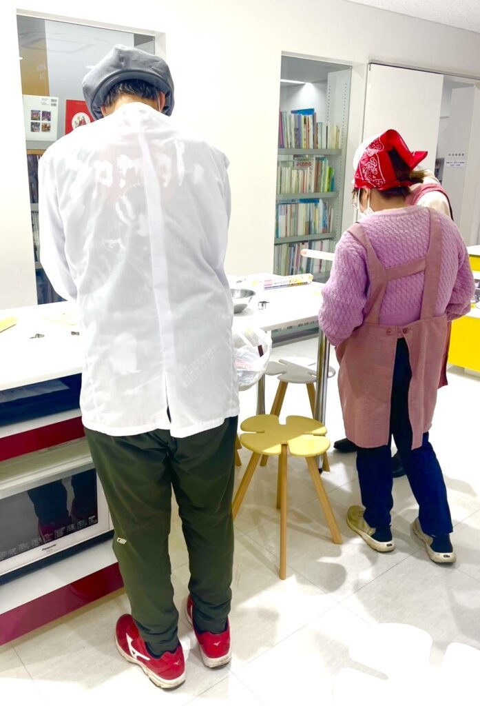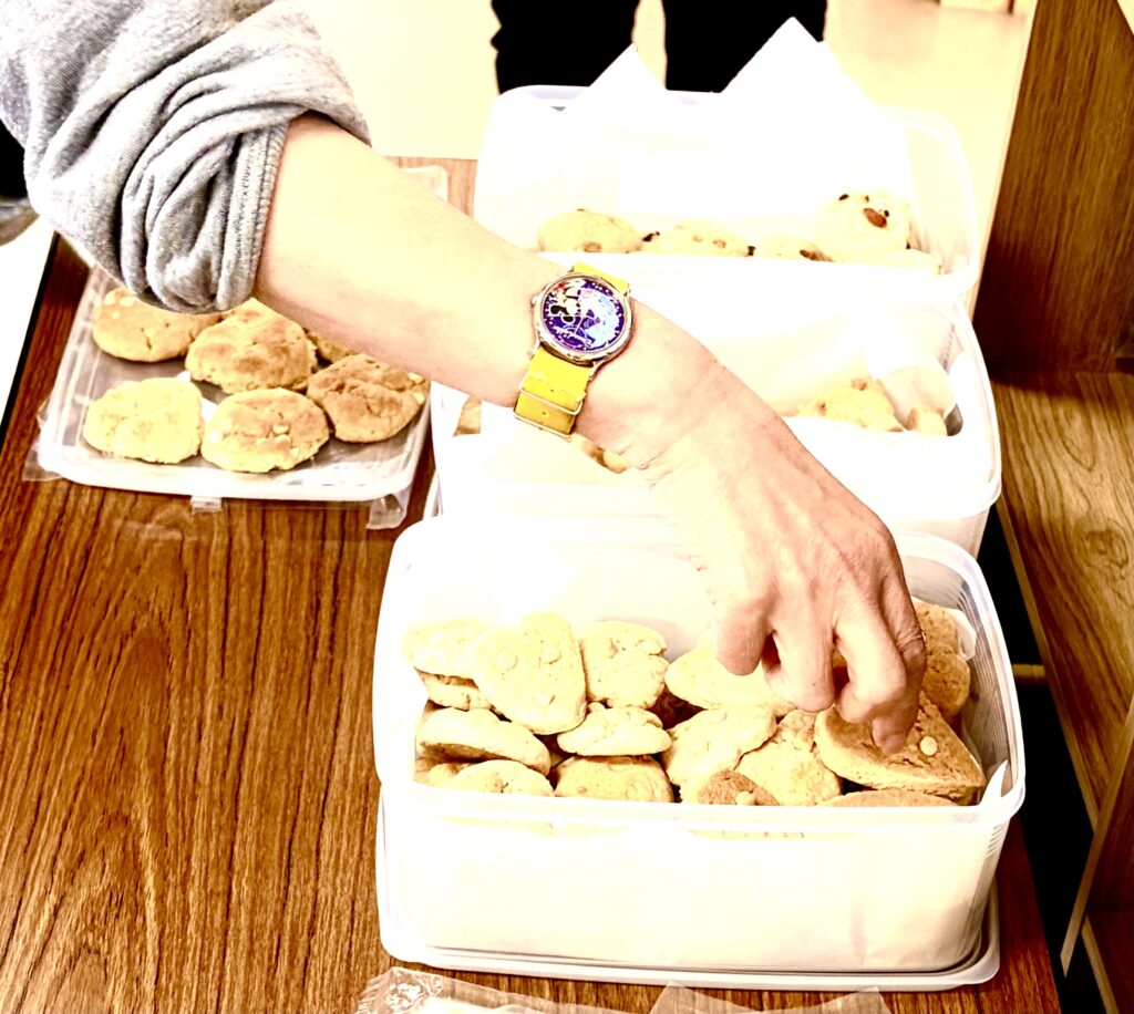 玉野市中央公民館内キッチンルームをかりて、午前4名のワーカーさんがクッキー🍪作りに参加。ニコニコ笑顔が印象的でした。